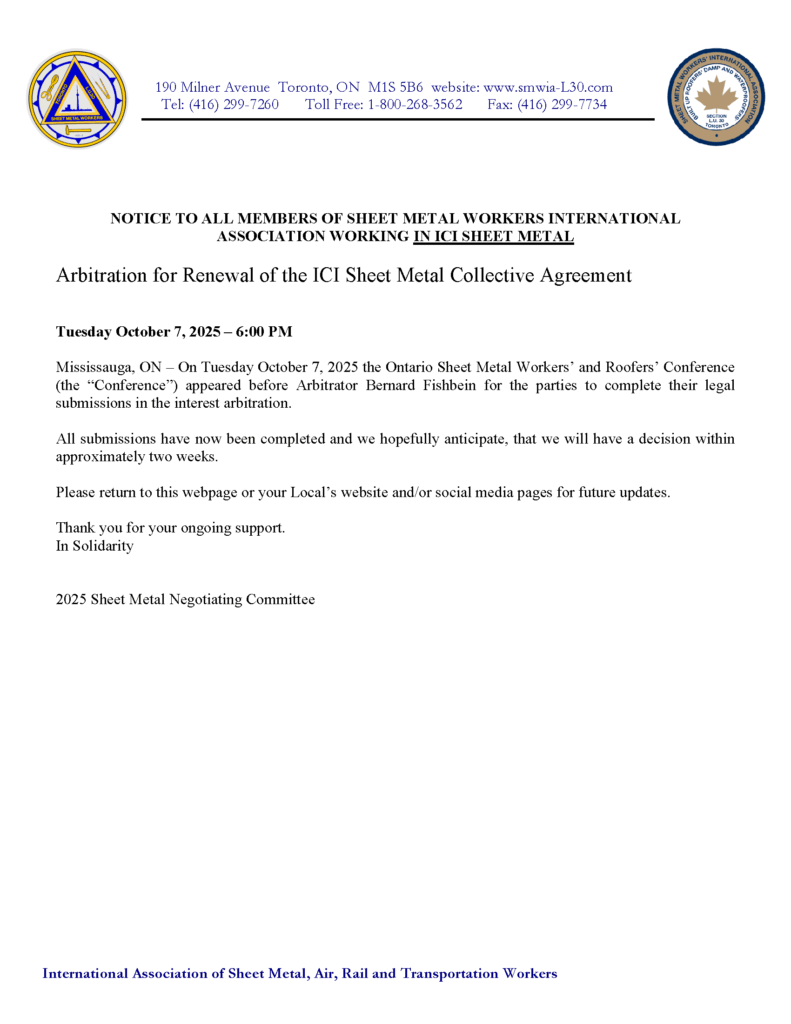 Arbitration for Renewal of the ICI Sheet Metal Collective Agreement