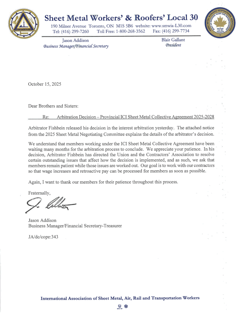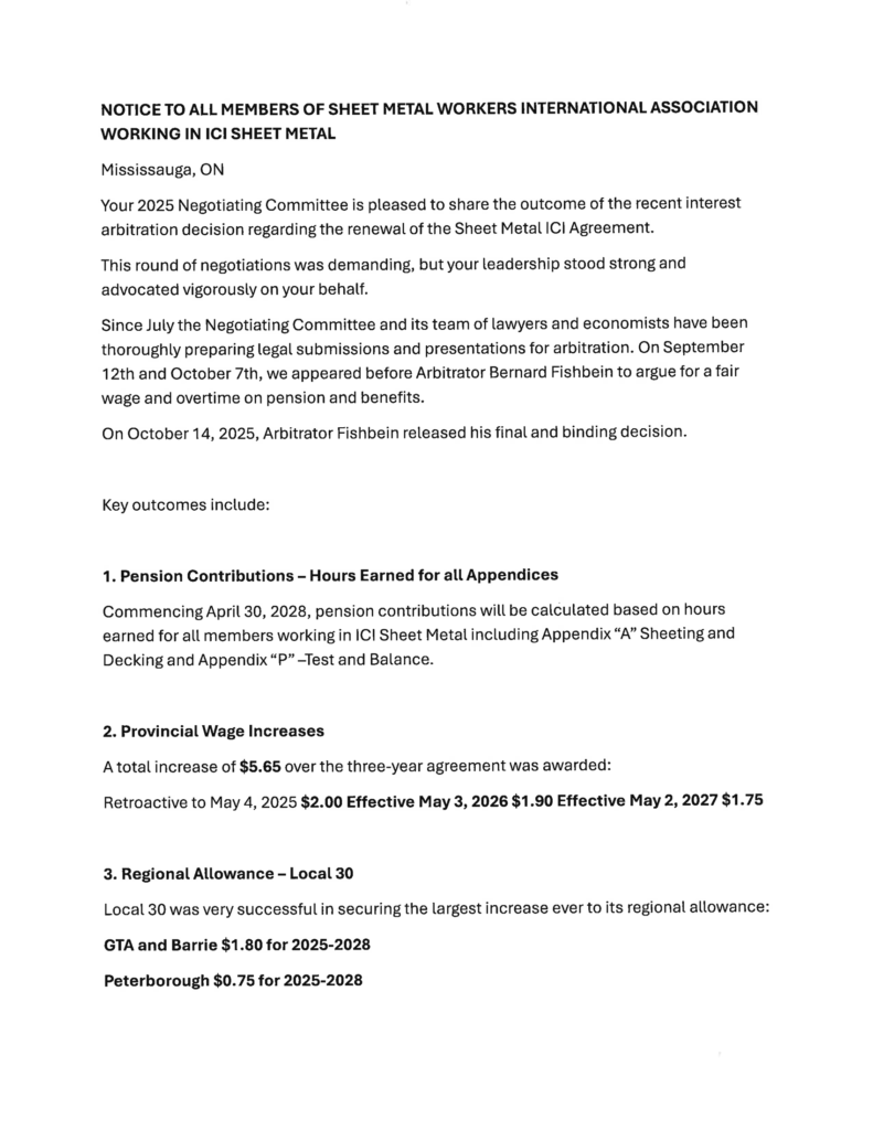 Important Notice for ICI Sheet Metal and Roofing Oct 7 2025